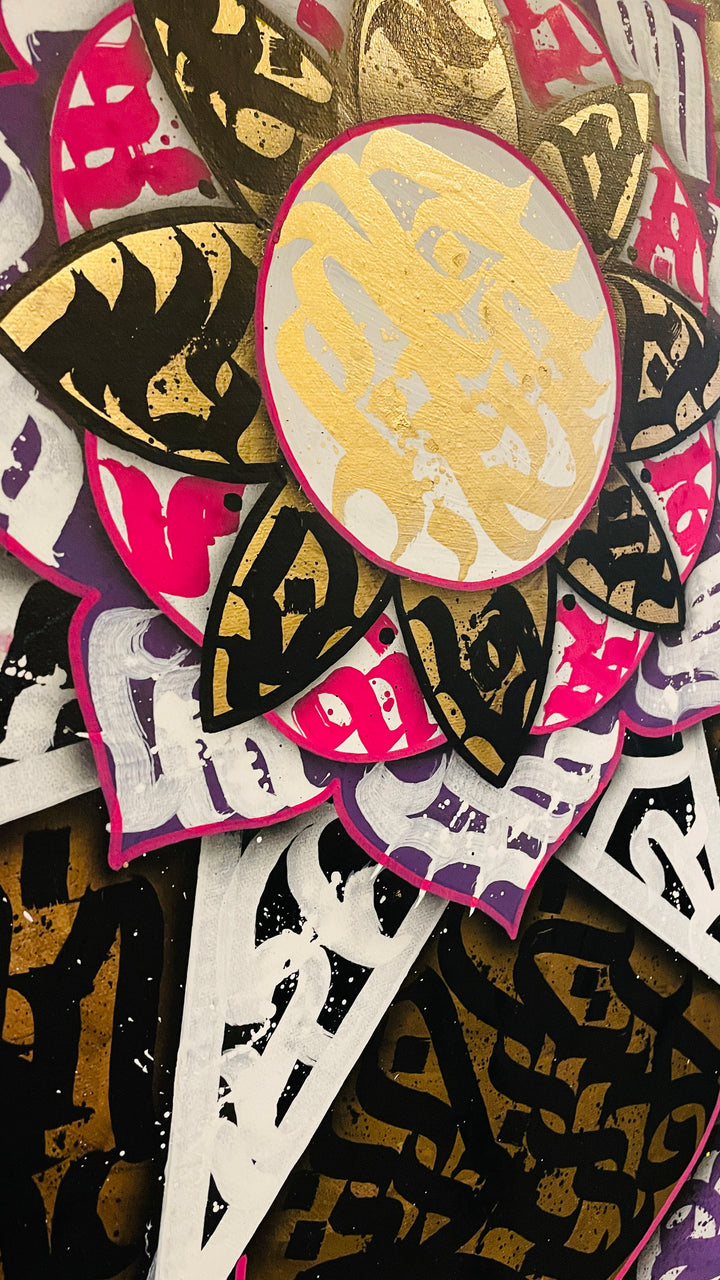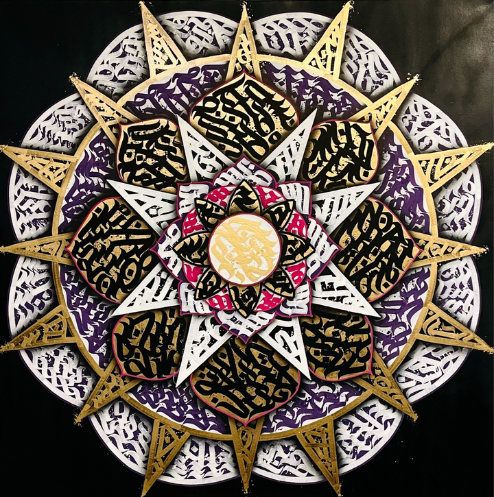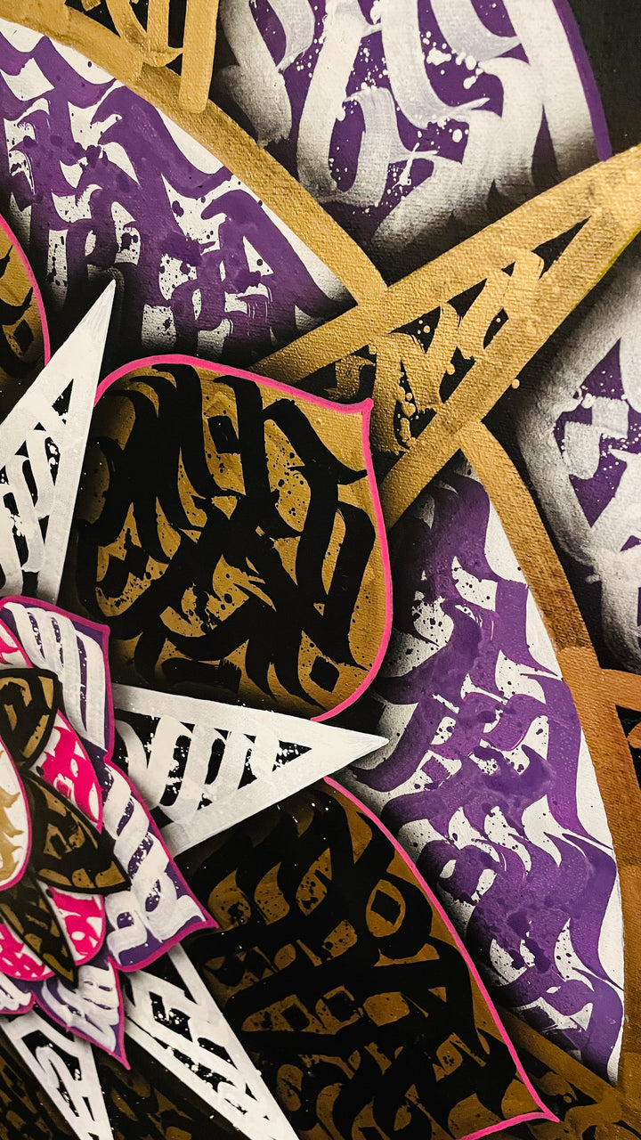 My goal with this piece was to push the limits of how calligraphy can be used in fine art — moving it beyond lettering into something more immersive and visual. The mandala-inspired layout pulls your eyes to the centre, but the wildness of the brush strokes keeps them moving around the canvas. It's urban calligraphy art with global inspiration — influenced by my travels, tattooing experience, and obsession with street culture aesthetics.